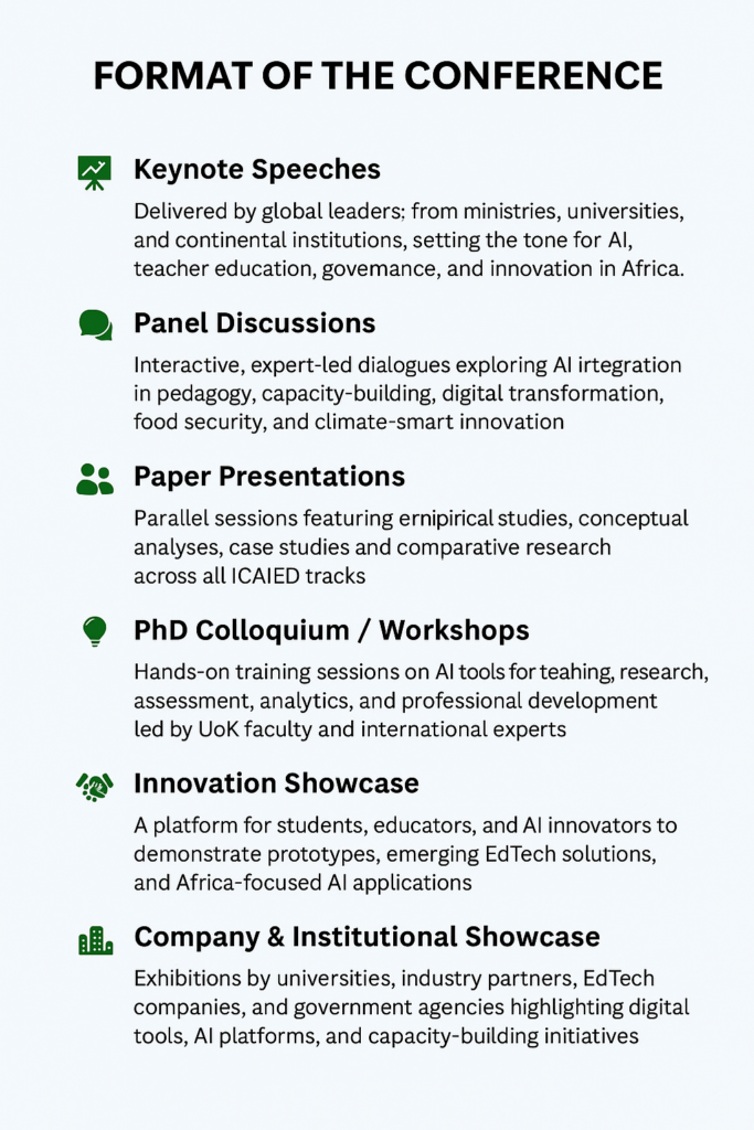 As artificial intelligence continues to reshape learning environments, assessment models, and pedagogical approaches, ICAIED 2025 provides a unique space to examine its transformative potential while addressing emerging challenges. Participants will engage in rich discussions, knowledge exchange, and practical explorations aimed at redefining the future of teacher-education across the continent.