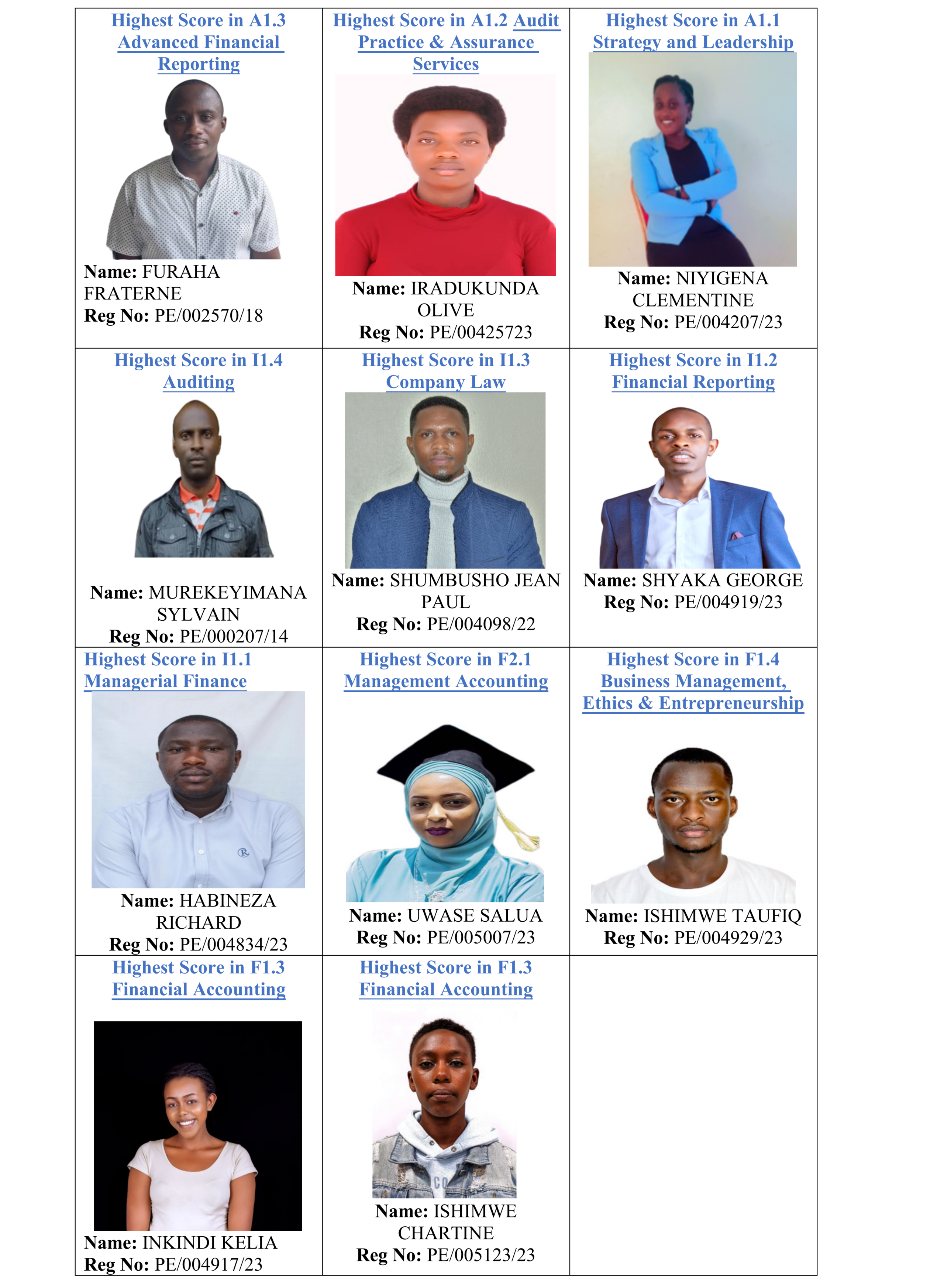 The University of Kigali’s Board of Promoters, management and staff take this opportunity to recognize and appreciate the 11 students in CPA who emerged the best nationally and all the UoK CPA students for achieving results above the national pass rates.